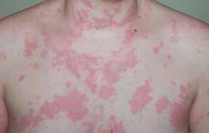 | Urticaria | Lesiones elevadas. Mayor a 10 mm de diámetro. Aparecen de forma deslocalizada y desorganizada. | ![]() |