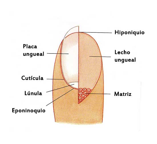 En cuanto a las uñas, éstas son placas de queratina ubicadas en las manos y pies con funciones protectoras. En la uña encontramos distintas estructuras anatómicas, a saber: